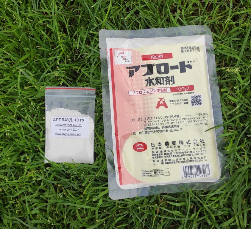 АППЛАУД — высокоэффективный инсектицид с продолжительным периодом защитного действия против насекомых отряда равнокрылых (щитовки, кокциды, белокрылка, цикадки, мучнистыми червецами) на томатах и огурце защищенного грунта, плодовых, декоративных растениях. Апплауд - системный препарат, он разносится по всему растению с соком, обеспечивая продолжительную защиту.