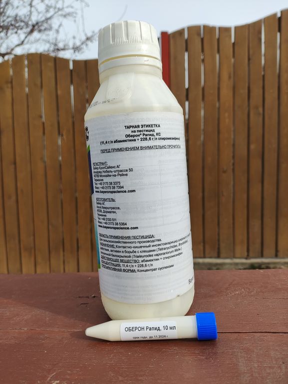 Действующее вещество спиромезифен, входящее в состав препарата Оберон Рапид, представляет новый химический класс тетроновые кислоты (кетоенолы). Приводит к нарушению процессов линьки, снижению фертильности имаго и замедлению роста ювенильных стадий вредителя. Абамектин - химический класс авермектины. Активирует высвобождение гамма-аминомаслянной кислоты (ГАМК), вследствие чего ингибируется передача нервного импульса.