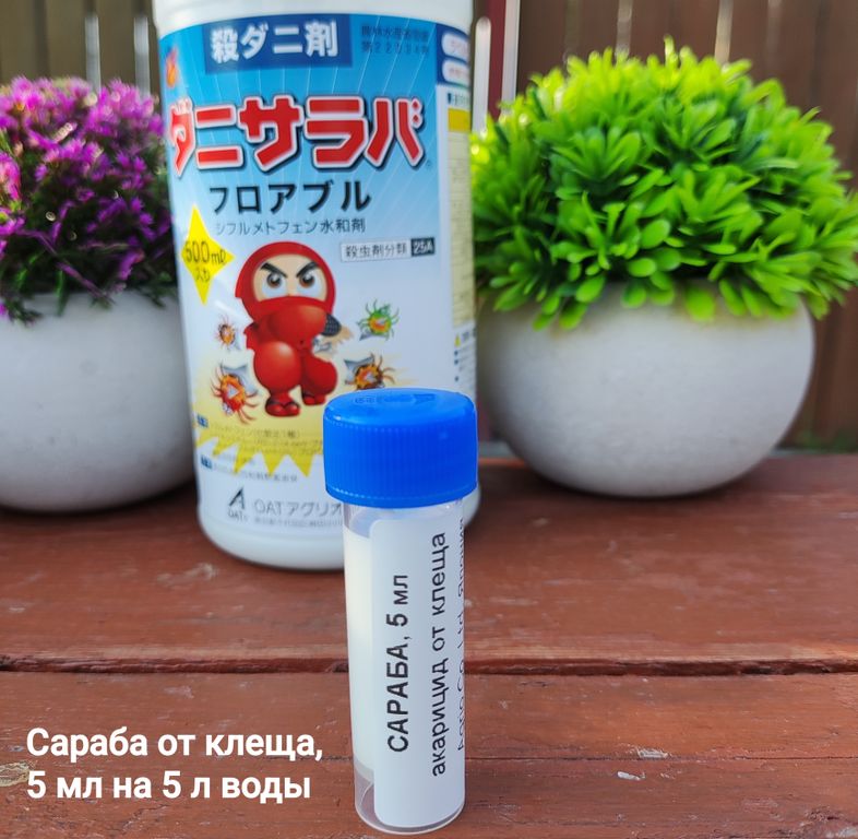 Сараба акарицид от клещей, не действует на насекомых! НЕ ИМЕЕТ ЗАПАХА! Эффективен на всех стадиях развития клеща: яйцо, личинка, нимфа, имаго. Эффективен против всех видов клещей. Эффективность Сараба доказана на культурах: яблони, груши, сливы, персики, цитрусовые, земляника, виноградники. Не фитотоксичен. Малоопасен для полезных насекомых. Действует в широком диапазоне температур, устойчив к смыванию осадками.